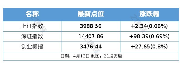 4月13日,市场震荡拉升,三大指数集体收红,创业板指盘中涨超1%,续创阶段新高。截至收盘,沪指涨0.06%,深成指涨0.69%,创业板指涨0.8%。沪深两市成交额2.14万亿,较上一个交易日缩量1725亿。