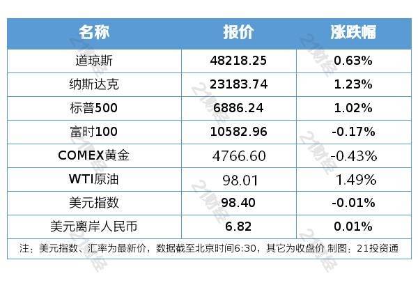 纽约股市三大股指4月13日上涨。截至当天收盘,道琼斯工业平均指数比前一交易日上涨301.68点,收于48218.25点,涨幅为0.63%;标准普尔500种股票指数上涨69.35点,收于6886.24点,涨幅为1.02%;纳斯达克综合指数上涨280.84点,收于23183.74点,涨幅为1.23%。